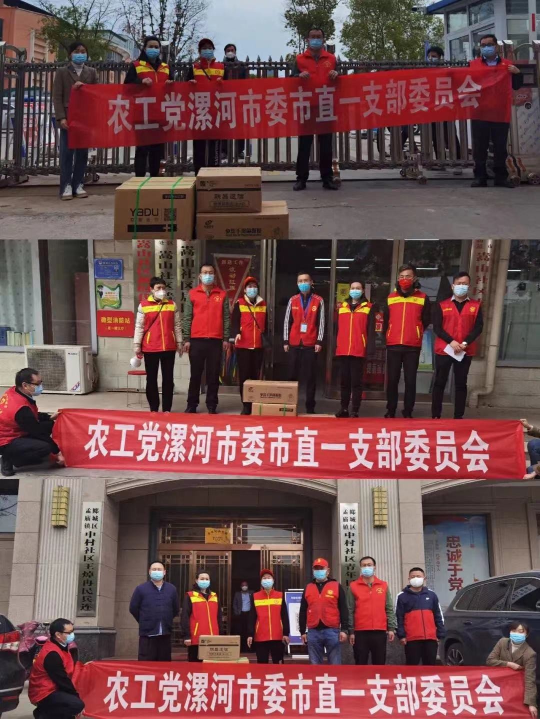 病毒无情,人间有爱。4月15号上午,市政协副秘书长、农工党漯河市委副主委郭宏毅带领市直一支部同志们,先后来到漯河市第五高级中学、嵩山社区党群服务中心和郾城区孟庙镇中村委会,为抗疫一线的基层单位捐赠防疫物资,以实际行动传递爱心,携手克难!此次共捐赠医用口罩6000个、消毒凝胶120瓶/500ml和消毒湿巾3600片等防疫物资。