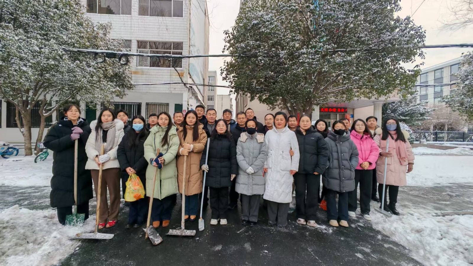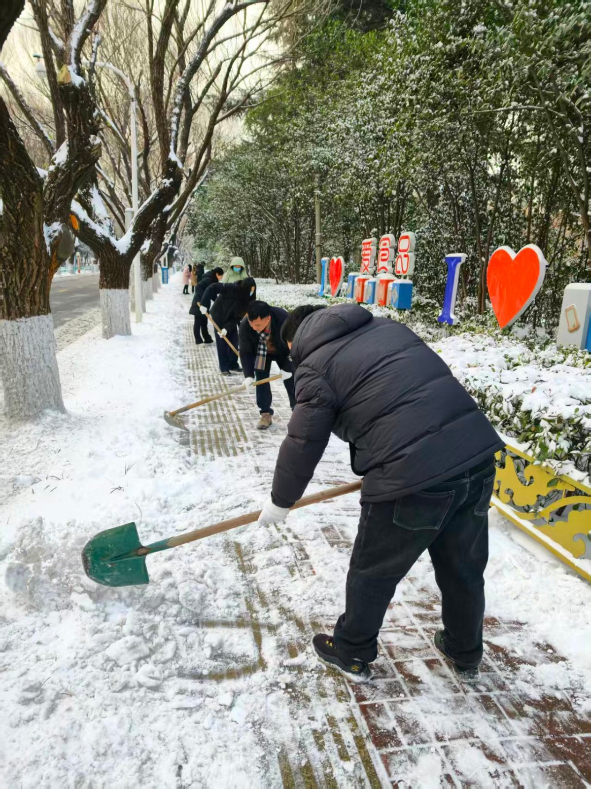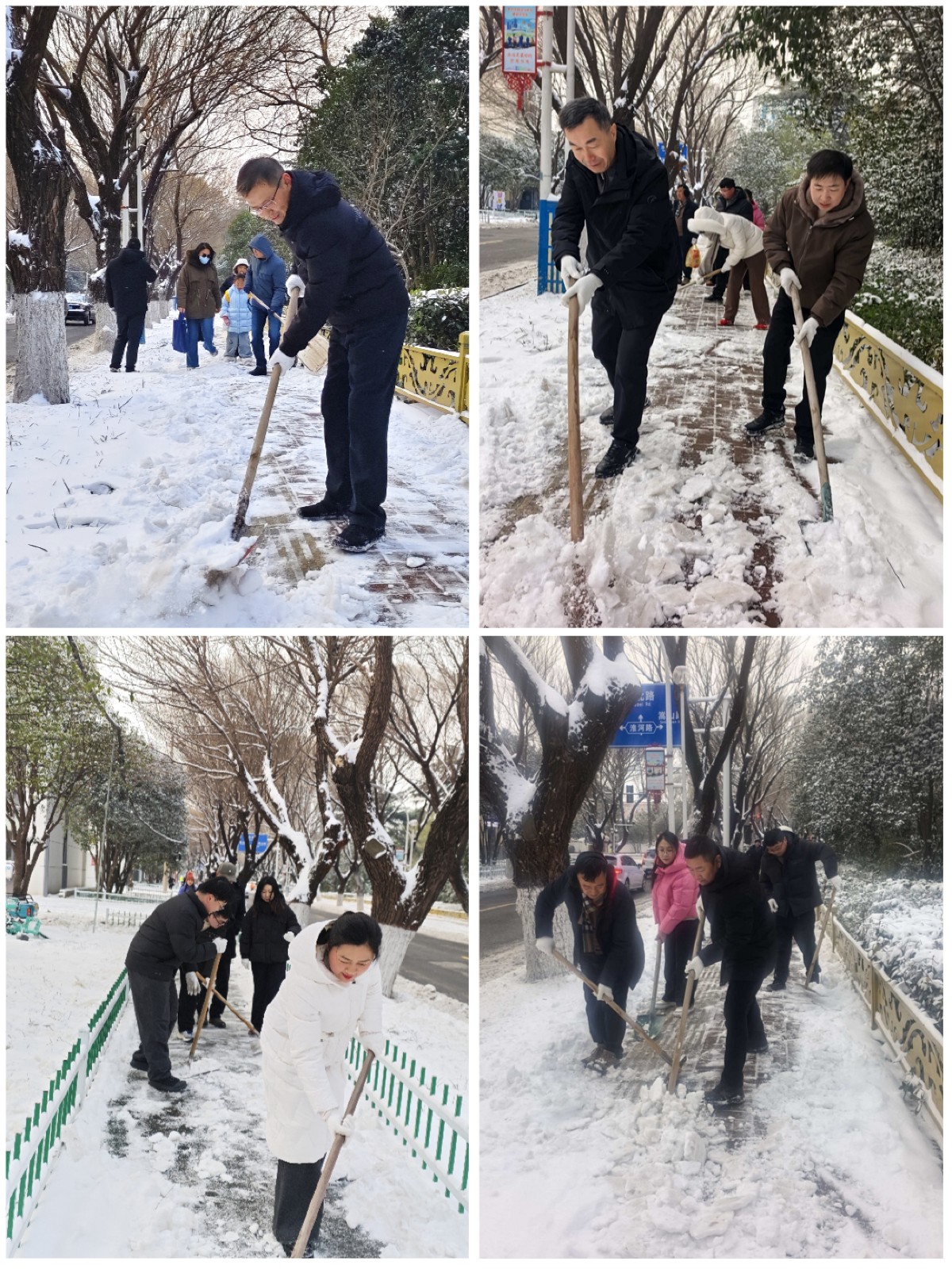 部机关领导带队冲锋在前,全体机关干部主动请缨、分工协作,手持铁锹等工具,对人行道、辅道的积雪展开全面清理。